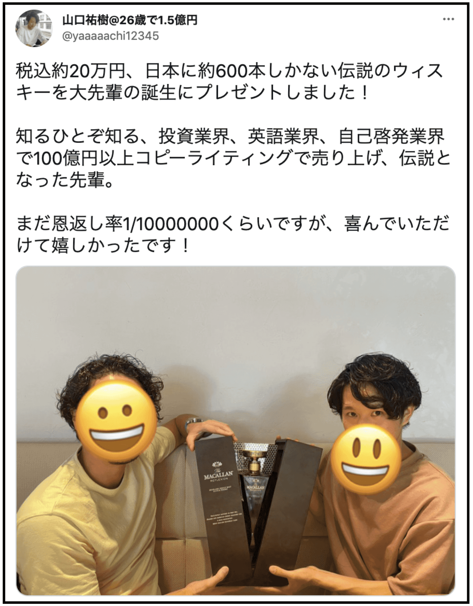 ・お世話になった先輩に日本に600本しかないウィスキーをプレゼント(20万円)したり。