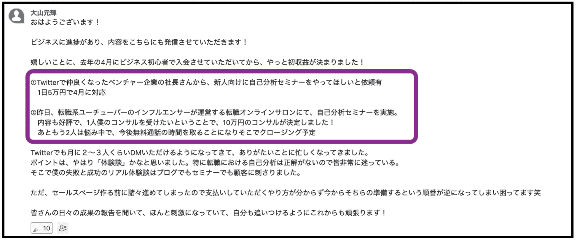 ◯激務サラリーマンしながら、大人気「自己分析セミナー講師」へ変身した大山さん。